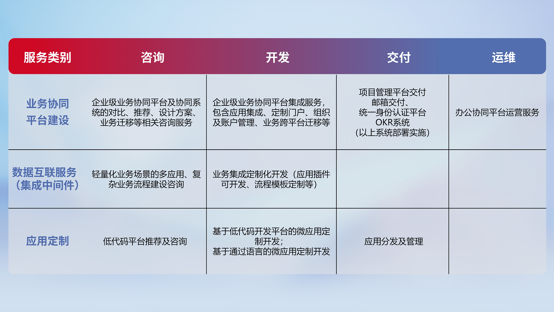 针对钉钉、、、企微、、、IDaas等平台级产品提供产品的规划、、方案、、交付、、、定制化开发等服务,,实现如统一协同办公、、、、智能客户服务、、混合会议管理、、、智能数据查询、、、等业务场景,,,,实现数字化转型。。。。