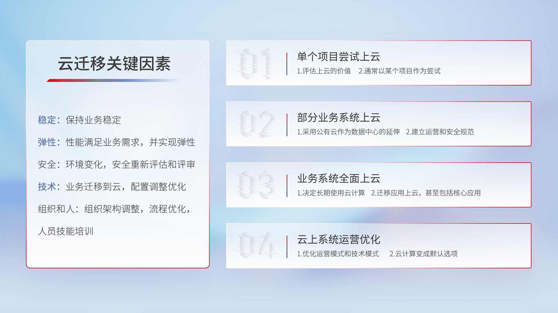 结合实际业务,,,,从规划设计、、、、云平台选型、、、云原生改造、、数据迁移、、集成交付,,,,迁移全过程为客户识别最佳上云路径,,,做好风险识别管理,,设计网络架构、、身份权限、、安全审计合规、、、操作审计、、、、日志审计、、、、监控告警策略、、、多站点容灾设计等,,,对云上基础设施进行整体规划,,,,提升IT治理水平,,,,以满足弹性、、高可用、、、、高性能的需求。。