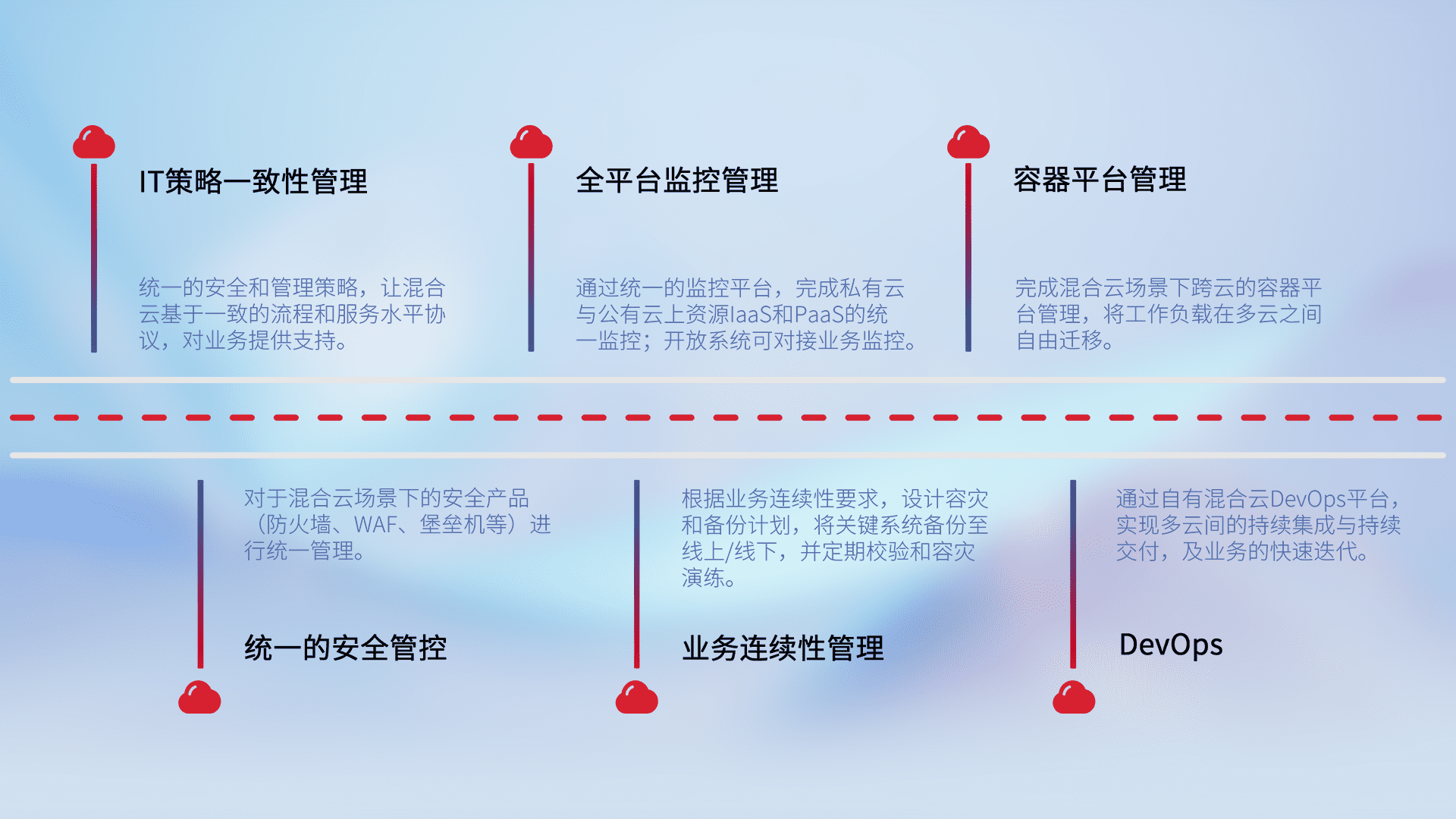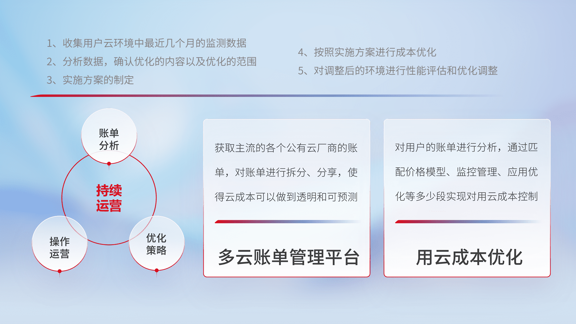 通过多云纳管,,,以统一的资源数据模型把客户的云资源进行抽象和封装,,,,进而实现对多云资源的统一操作,,,,保障云资源管理的可靠性、、、、稳定性与可用性。。量身定制化运维内容,,配置、、、、开发运维、、、、补丁管理、、备份、、、、监控、、、、认证和访问管理、、、审计和日常巡检等,,,保障在用云过程中的可靠度,,,,稳定度以及高可用率。。